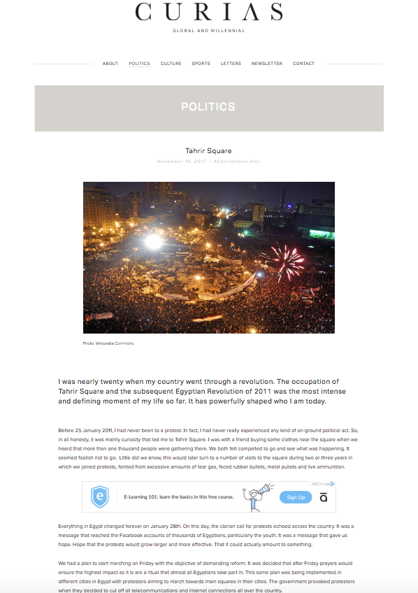 Abdelrahman Amr explores the occupation of Tahrir Square Nov 20, 2017 | Articles 20th March 2018 In this Curias blog, Abdelrahman Amr reflects on his experiences of the occupation of Tahrir Square and the subsequent Egyptian Revolution of 2011. Read the full blog here