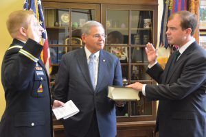 Major Andersen of the U.S. Army swore 2016 Gabr Fellow John Ryan as a First Lieutenant in the U.S. Army, on Thursday, August 3, with Senator Robert Menendez of New Jersey, a former boss of John, holding the U.S. Constitution.