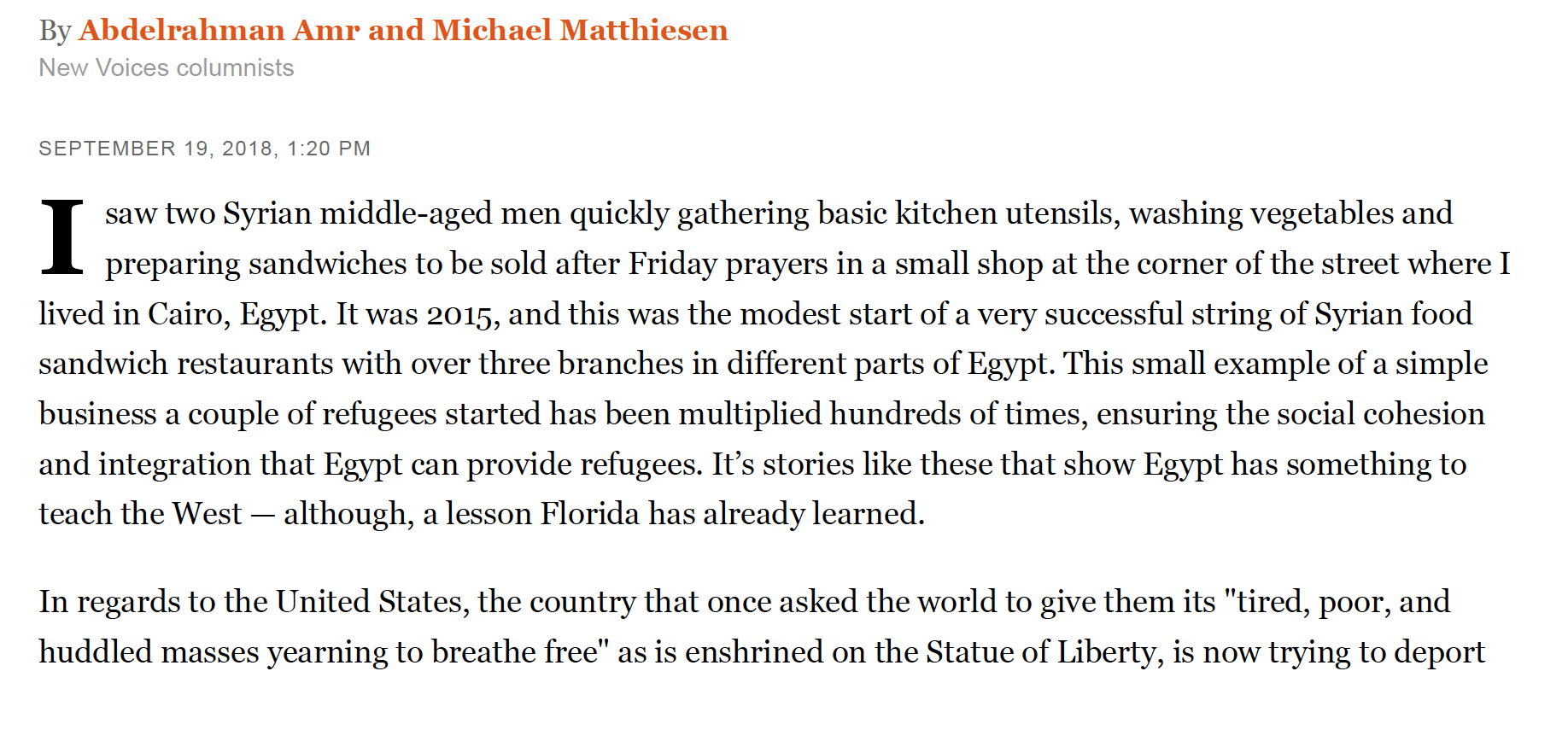 In this Orlando Sentinel Opinions piece, Abdelrahman Amr and Michael Matthiesen consider what the Western world might learn from Egypt’s approach to the refugee crisis, amidst the political turmoil that Egypt has been facing since the January revolution.